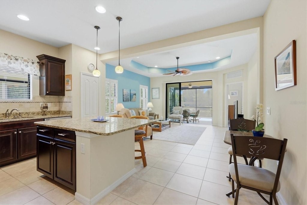Experience the ease and elegance of resort-style living in this beautifully appointed, maintenance-free residence located in the sought-after Martinique section of Boca Royale. This turnkey home offers 2 bedrooms plus a versatile den/office with glass panel French doors, 2 baths, and a spacious 2-car garage. Designed for both comfort and style, the kitchen features a gas range, stainless steel appliances, granite countertops, tiled backsplash, and a center island perfect for entertaining. The inviting living room is enhanced by a tray ceiling and plantation shutters, while the extended lanai-with sunscreen for added shade-overlooks a picturesque lake, creating the perfect setting for relaxation. The serene primary suite enjoys tranquil water views and includes both a walk-in and standard closet, along with a well-appointed bath featuring dual vanities and a walk-in shower. Additional highlights include full hurricane protection, LG washer and dryer, upgraded comfort-height commodes, gas dryer and water heater, and a brand-new garbage disposal installed in April 2026. With highly desirable southwest rear exposure and located in an "X" flood zone, this home offers both peace of mind and exceptional outdoor enjoyment. Residents of Martinique enjoy a true maintenance-free lifestyle, with the association handling all lawn care, mulching, trimming, irrigation, and exterior painting-freeing your time to indulge in the community's exceptional amenities. A private neighborhood pool, spa, and outdoor grilling area are just steps away, while ownership also includes a social membership to the Boca Royale Country Club, where a vibrant calendar of activities awaits alongside a recently renovated clubhouse, restaurant, and stylish modern bar. Optional memberships for golf, tennis, and pickleball further enhance the lifestyle. With no CDD fees and a prime location near the pristine beaches of Manasota Key and Englewood Beach, as well as the dynamic amenities of Wellen Park and Venice, this home truly embodies the best of Florida's resort lifestyle.